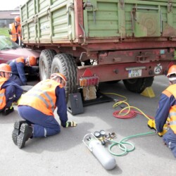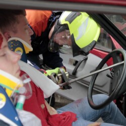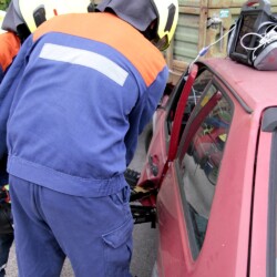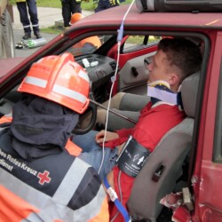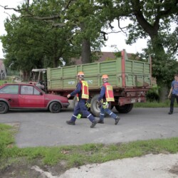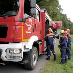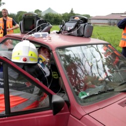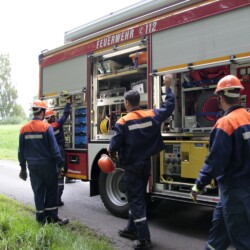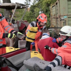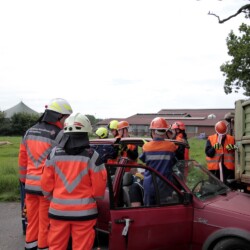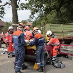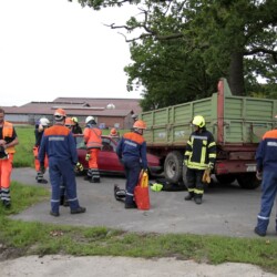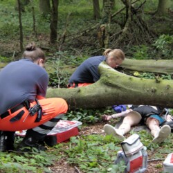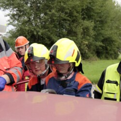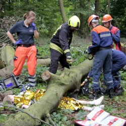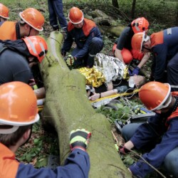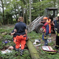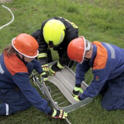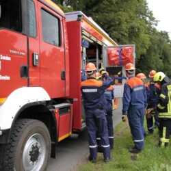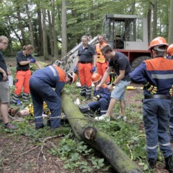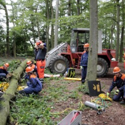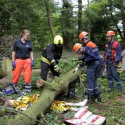 Bereits kurz nach dem Frühstück erfolgte die erste Alarmierung – nicht, wie gewohnt, mit dem Alarmgong, sondern über eine Alarmierungs-App. Technische Hilfeleistung 2 war das Alarmstichwort, mit dem zwei Löschfahrzeuge und ein RTW alarmiert wurden. Vor Ort fanden die Jugendlichen eine Person vor, die unter einem Baum eingeklemmt war und nach der medizinischen Versorgung darunter befreit werden musste.