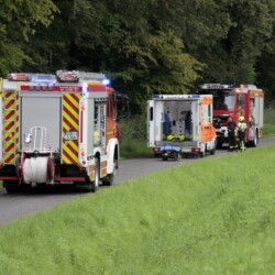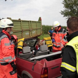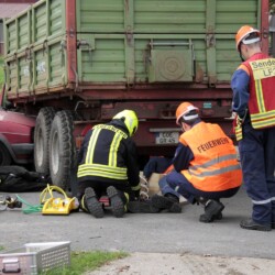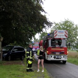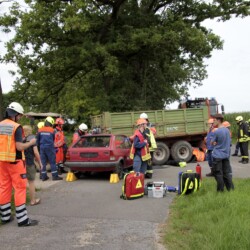 Der dritte Einsatz des Vormittags führte die gesamte Truppe nach Bösensell: Hier war es zu einem Verkehrsunfall zwischen einem Pkw und einem Trecker mit Anhänger gekommen, bei dem zwei Personen im Pkw und eine unter dem Anhänger eingeklemmt waren.