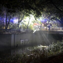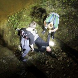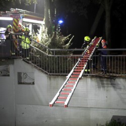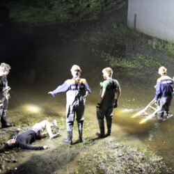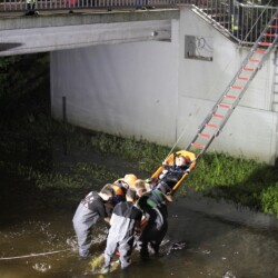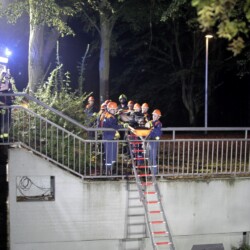 Nach dem Abendessen ging es zur Marienkapelle am Schloss. Hier war ein Schwimmer auf dem Heimweg vom Kanal in das Steverbett gestürzt und hatte sich das Knie verletzt. Mit Hilfe einer Leiter und einer Schleifkorbtrage wurde der Verletzte aus dem Flussbett gerettet.