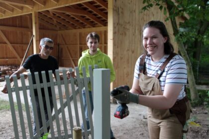 Die Arbeiten, die in der vergangenen Woche angegangen wurden, hinterließen sichtbarere Spuren: So wurde in einem gemeinsamen Kraftakt die Hütte des „Baustellen-Cafés“ innerhalb des Innenhofes umgesetzt, um Platz für die Einrüstung des Mannenhauses zu schaffen. Außerdem wurde das provisorische Geländer zum Eingang des Rombergtraktes sowie das Gartentor zur künftigen Gartenlehrwerkstatt frisch gestrichen.