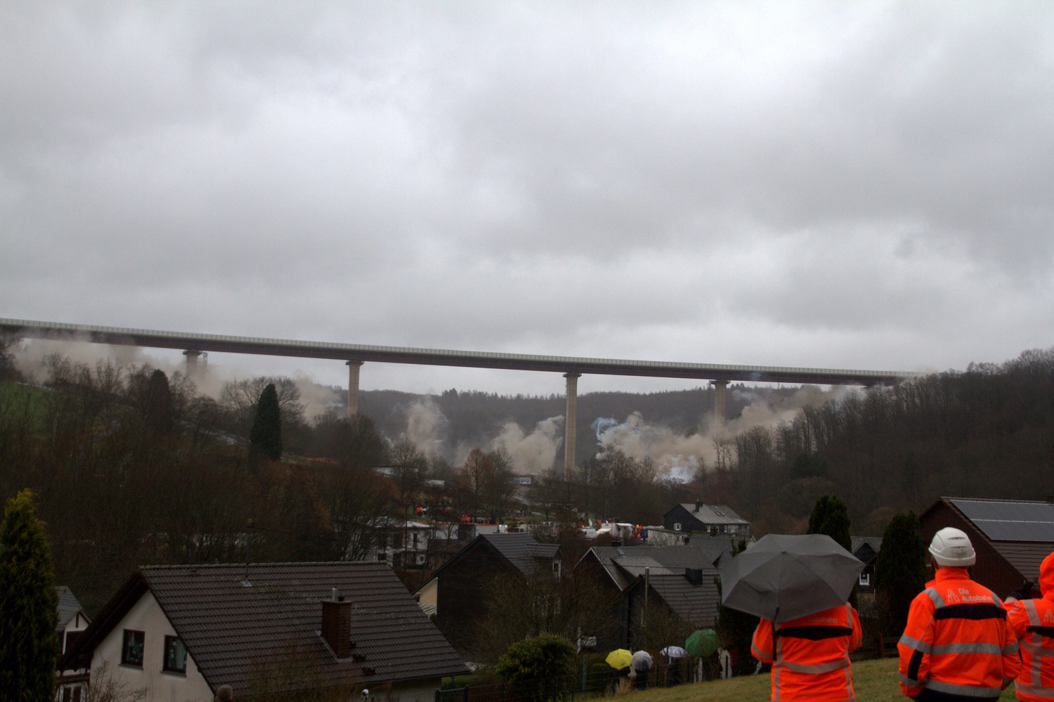 Bereits in den frühen Morgenstunden ist das Lampenfieber beim Sprengteam und den Mitarbeitern der Autobahn Westfalen deutlich spürbar. Minutiös wurde dieser Tag geplant – seit mehr als einem halben Jahr laufen die Vorbereitungen. Nichts wird dem Zufall überlassen: Drei Stunden vor dem eigentlichen Sprengtermin beziehen die 59 Absperrposten ihre Positionen, um den Sperrbereich rund um die Talbrücke abzuschotten. Eine Stunde vorher wird die A45 in beiden Fahrtrichtungen voll gesperrt. Alles läuft nach Plan. Um Punkt 11 heißt es dann „Drei, zwei, eins – Zündung“ – und nur vier Sekunden später stürzt das Bestandsbauwerk in die Tiefe. Das fertige neue Teilbauwerk, über das bereits seit einigen Wochen der Verkehr uneingeschränkt fließt, rückt nun ins Blickfeld. In den folgenden Stunden begutachten die Bauwerksprüfer die neue Brücke und stellen sicher, dass das Bauwerk während der Sprengung keinen Schaden genommen hat.