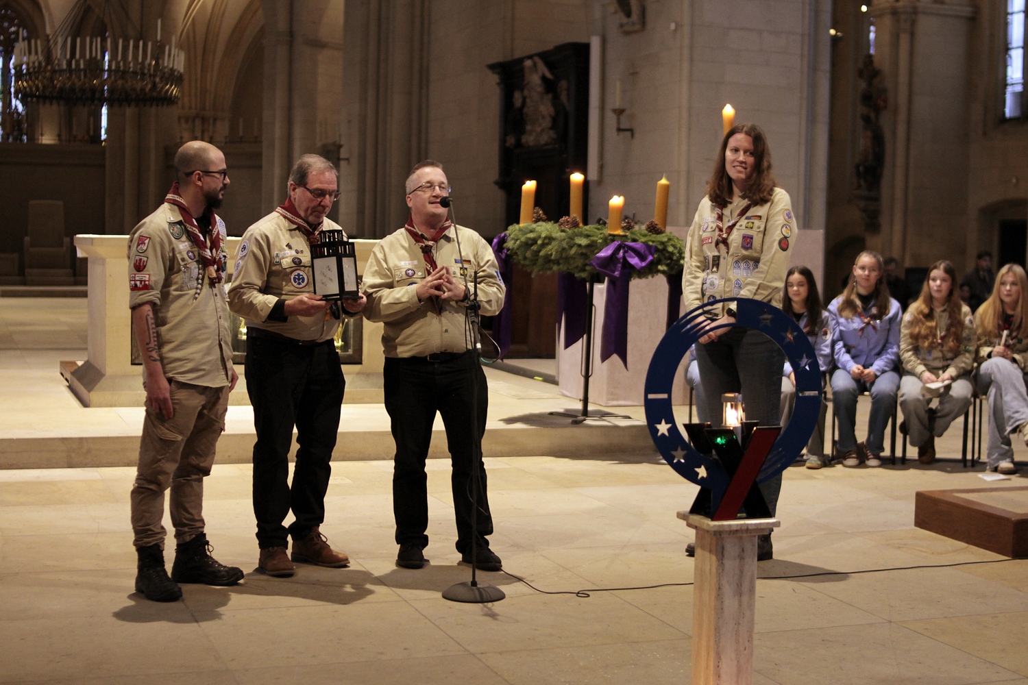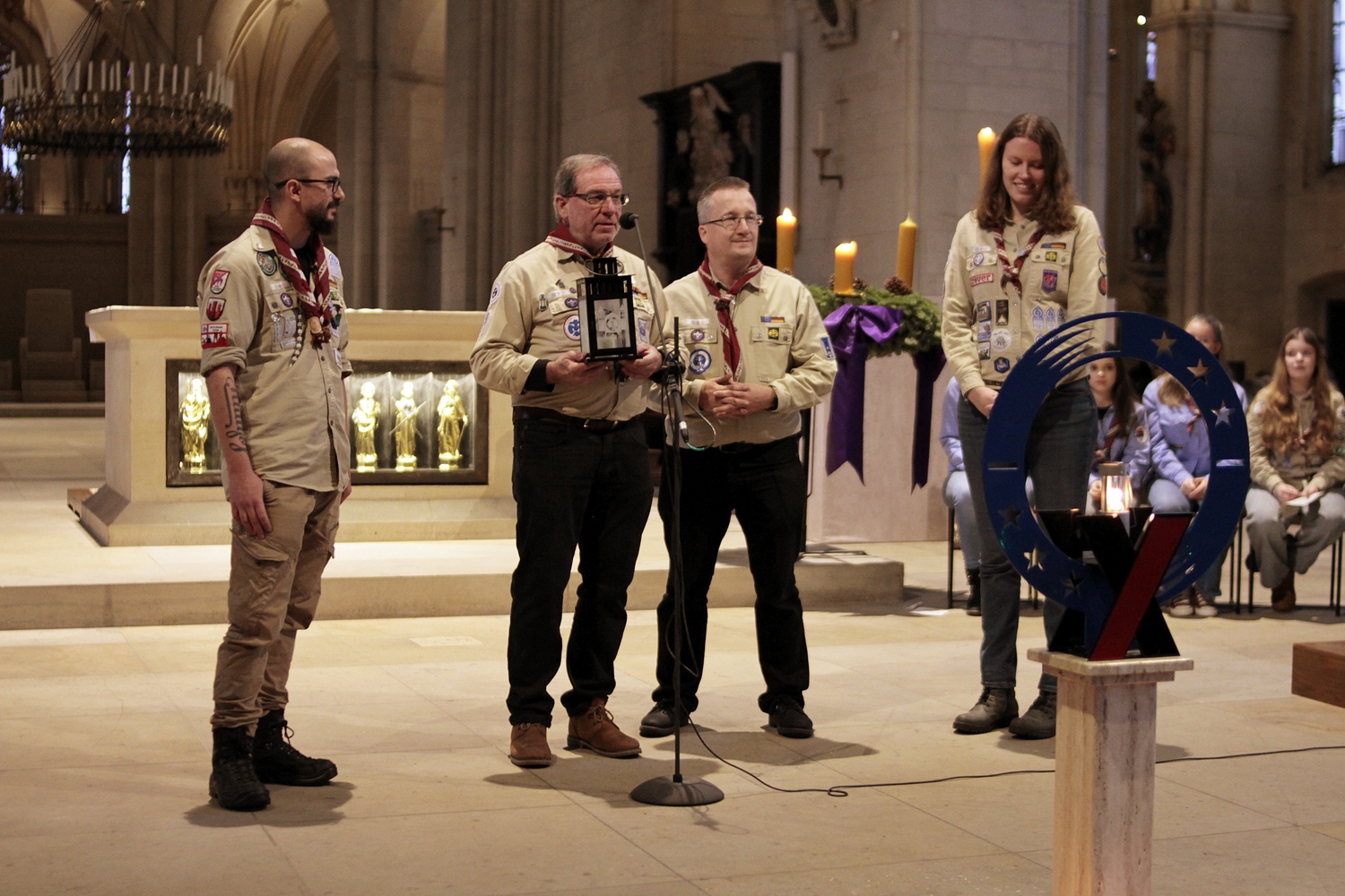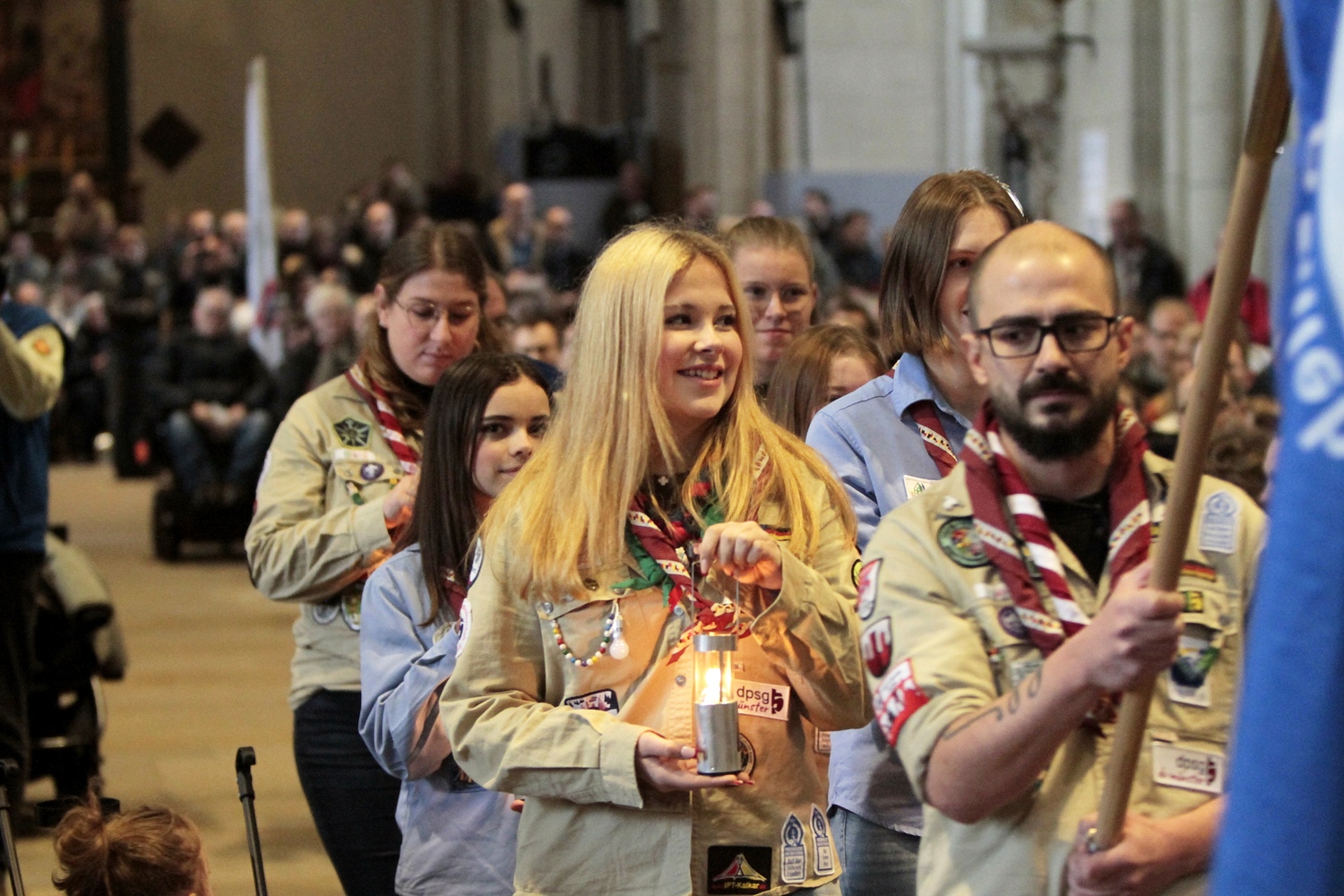 Im vollbesetzten St.-Paulus-Dom feierten am 3. Adventssonntag Pfadfinderinnen und Pfadfinder der katholischen Verbände Deutsche Pfadfinder*innenschaft St. Georg (DPSG) und Pfadfinderinnenschaft St. Georg (PSG) sowie des evangelischen Verbandes Christlicher Pfadfinderinnen und Pfadfinder (VCP) . Die ökumenische Aussendungsfeier stand ganz im Zeichen des Jahresmottos „Ein Funke Mut“. In Predigt und Beiträgen wurde deutlich, dass Frieden oft bei kleinen Schritten beginnt – bei Zivilcourage, Solidarität und dem Mut, füreinander einzustehen.
