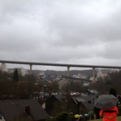 Der Anspannung folgt um kurz nach 11 Uhr die Erleichterung: Sprengmeister Michael Schneider und sein Team haben mit der Sprengung der rund 70 Meter hohen und 485 Meter langen A45-Talbrücke Rinsdorf Geschichte geschrieben. Noch nie wurde eine so hohe Brücke in Deutschland zu Boden gebracht. Nun liegt die Brücke sicher in ihrem vorbereiteten Fallbett. Acht Pfeilerpaare sind wie ein Zollstock zusammengeklappt, der Überbau ist senkrecht zu Boden gestürzt.